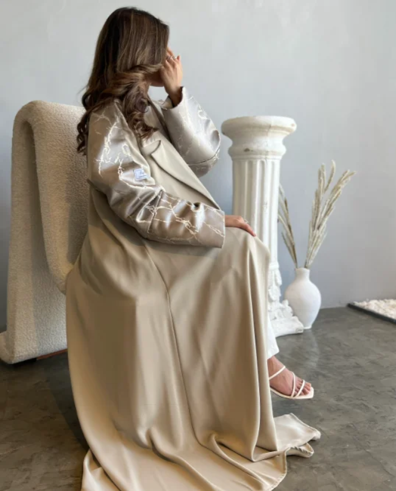 عبايات لون بيج تصميم مفتوح رسمي يناسب كافة الأذواق. مع خياطة متقنة، تمنحك مظهراً عصريًا وأنيقًا يناسب المناسبات الرسمية والاجتماعية. توفر راحة كبيرة وتضفي لمسة من الرقي والتميز على إطلالتك.